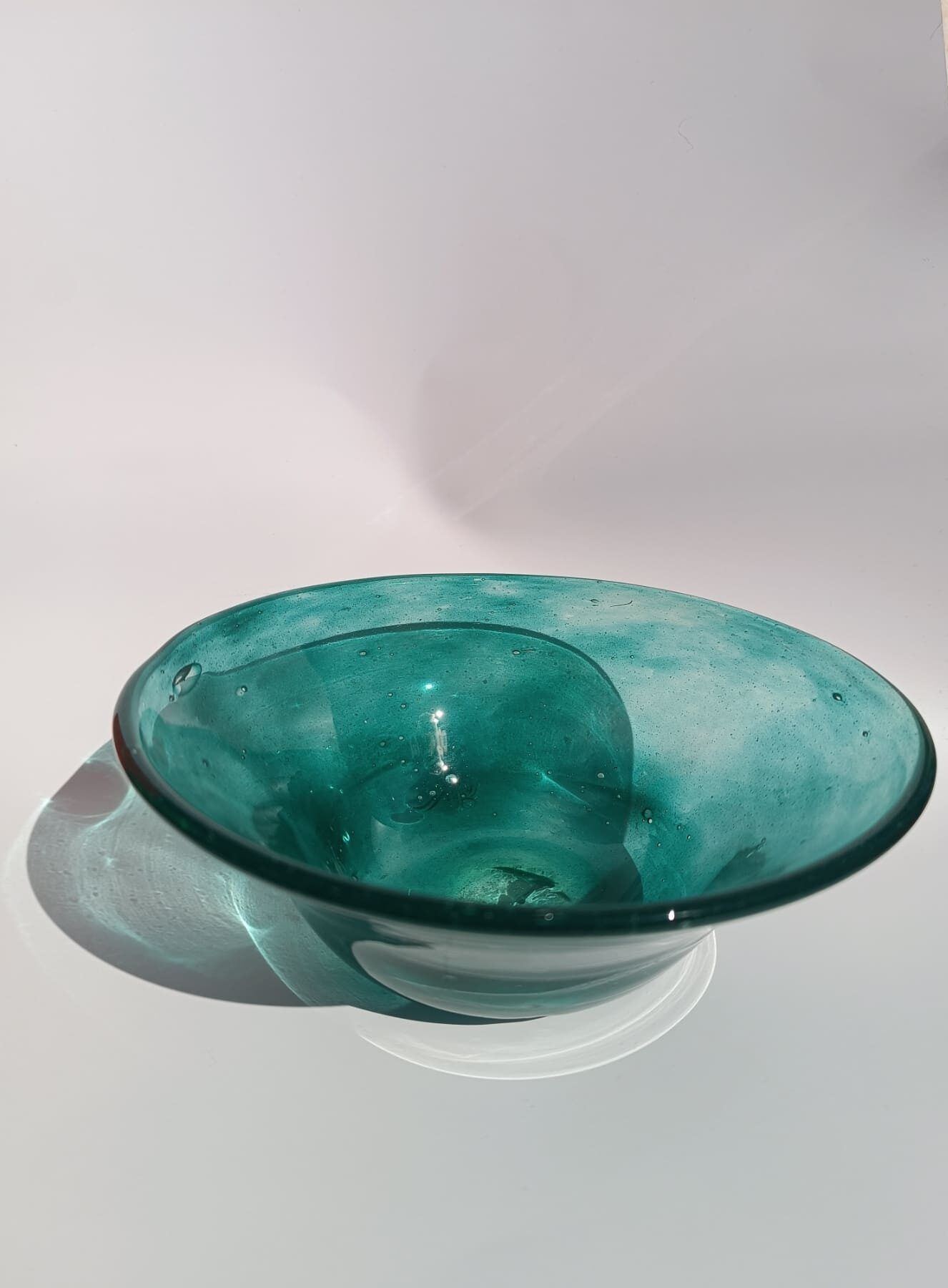 Large Glass Bowl «The Basin»: A stone-like embrace of blown glass Aegean Emerald. Ethos, robustness, and serenity, born from the human breath.