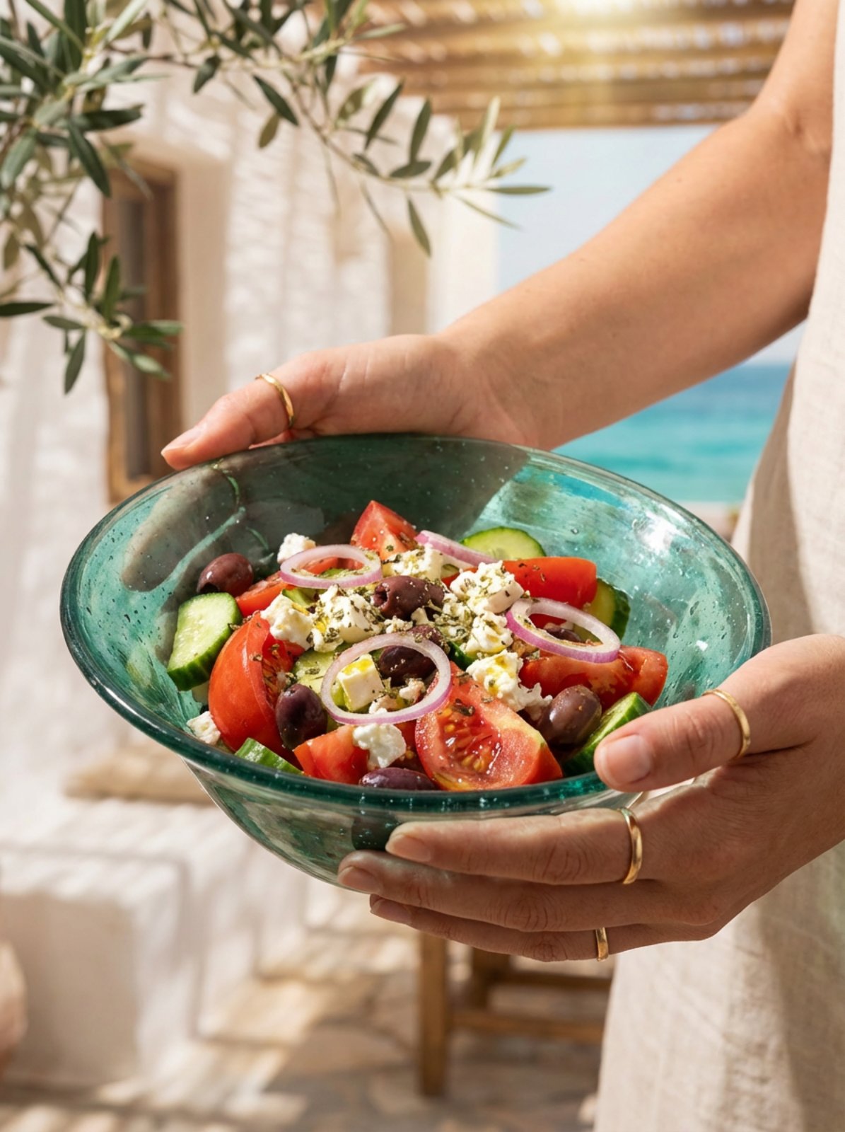 In nature’s grammar, if the Source is the point of birth, the Basin is the place where “Water” calms, gathers, and is generously offered. This large mouth-blown glass bowl is inspired by the stone, carved reservoirs found along the paths of Samos. It captures robustness and fullness, encapsulating the deep emerald color of the Aegean. It is designed to be the centerpiece of the table, where nature’s abundance meets artisanal craft.