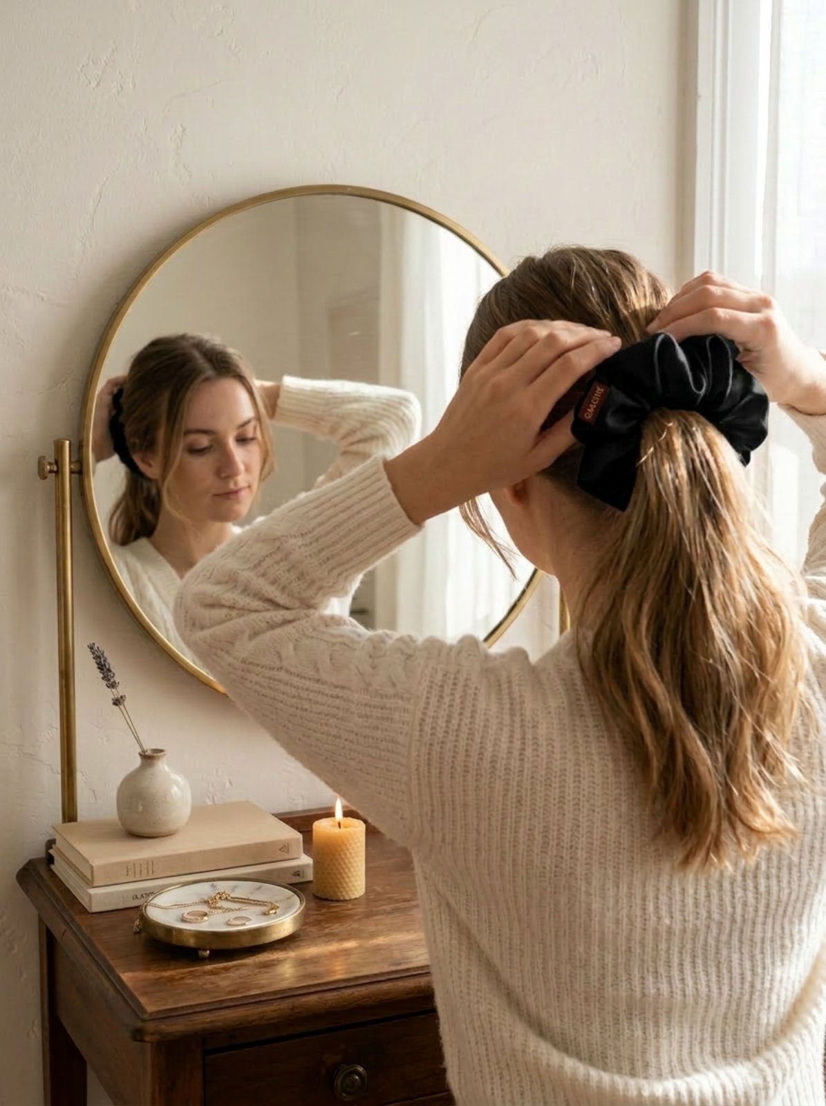 An accessory designed strictly as an object of touch and visual harmony. Crafted from luxurious satin fabric, it is designed to glide gently, offering absolute protection, preventing hair breakage and unwanted friction.