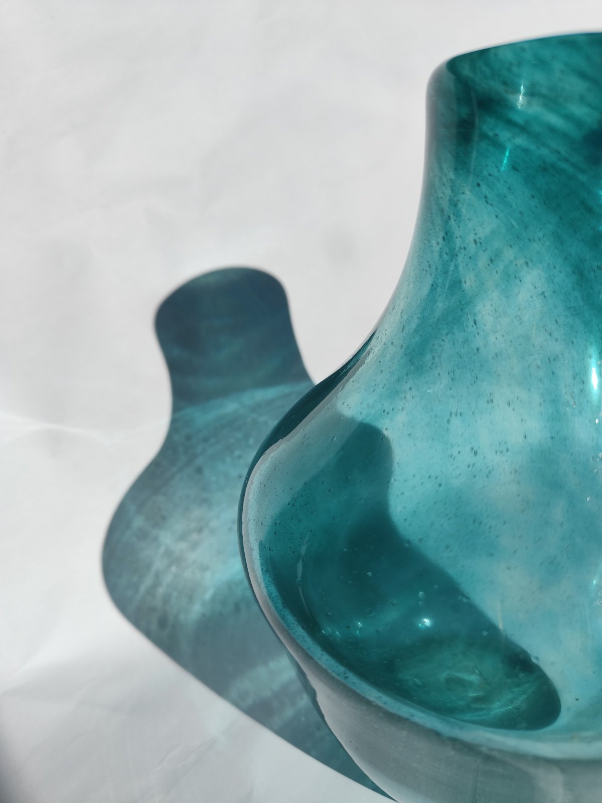 To create this volume, the silent strength of the ocean itself is required. The largest vase in the collection is the ultimate proof of the art of blown glass. Its body is imposing and profound, capturing the tranquility hidden beneath the water’s surface. Its intense Aegean Emerald color becomes denser at the curves—just as water darkens in the deep—and more transparent at the neck, where the light manages to break through. A statement piece, ready to welcome imposing branches or stand alone as a sculpture, bringing the essence of the water element into your Isichastyrio.